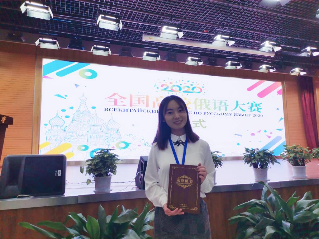 10月24-25日,由教育部主办、黑龙江大学承办的2020年全国俄语大赛复赛和决赛阶段在哈尔滨举行。太阳成集团tyc33455cc俄语系员工在此次俄语大赛上再创佳绩。2017级卢冬雪同学获得高年级组三等奖,同时获得国家留学基金管理委员会秘书处全额资助赴俄罗斯攻读学位资格。2019级金黎杰同学获得低年级组优胜奖。