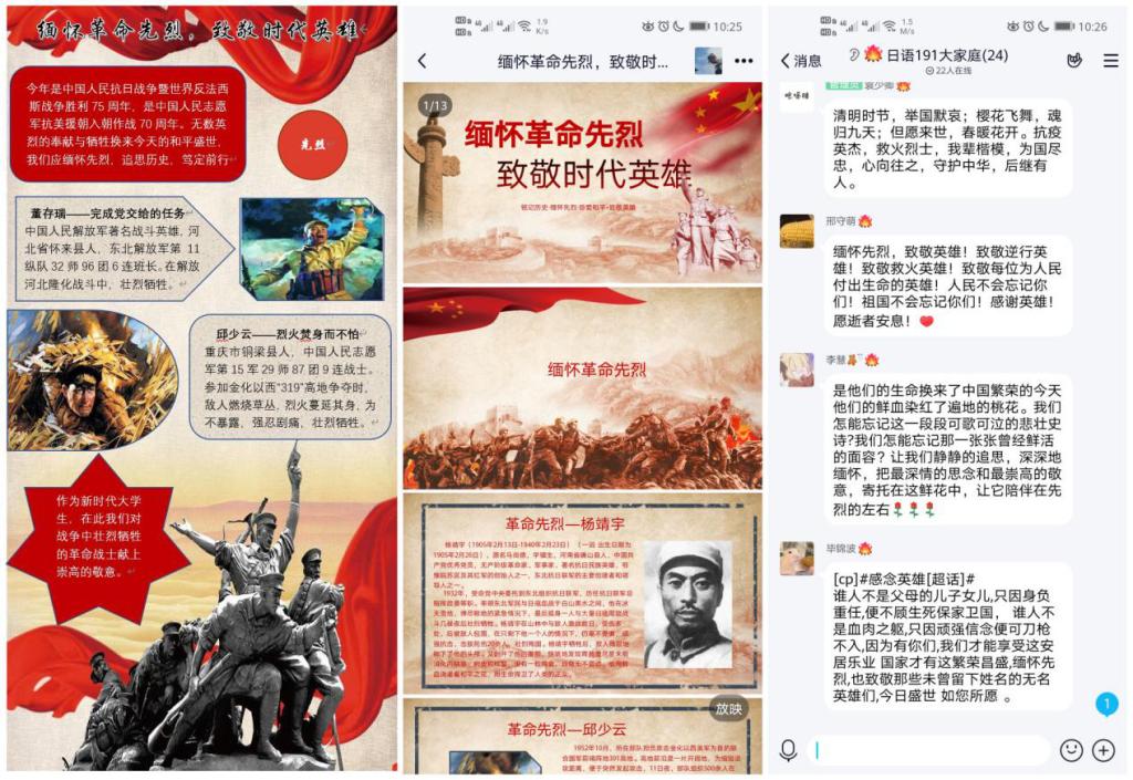 2020年是中国人民抗日战争暨世界反法西斯战争胜利75周年,也是中国人民志愿军抗美援朝入朝作战70周年,为激励广老员工弘扬以爱国主义为核心的伟大民族精神,学习继承革命先烈遗志,领会新时期下弘扬红色精神的重要意义,太阳成集团tyc33455cc组织了“铭记历史,致敬英烈”主题团日活动。活动中,同学们以制作海报、讲述革命故事、展示时代英雄事迹、线上发表感想等形式致敬那些为国牺牲的英雄烈士,引起同学们强烈的精神共鸣,激发了同学们的爱国激情。