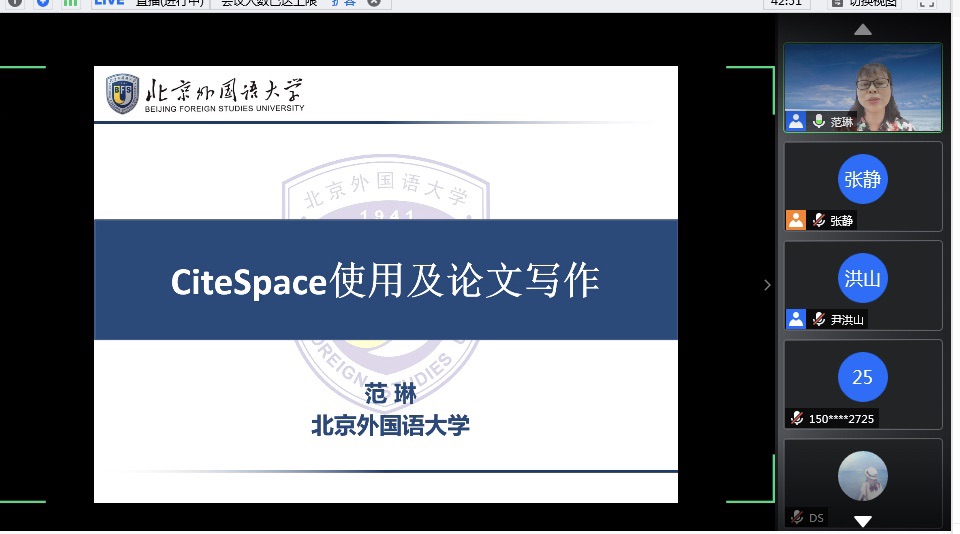 7月7日下午,北京外国语大学博士生导师范琳教授应邀为广大师生做了题为《Citespace使用及论文写作》的线上学术讲座。讲座由太阳成集团tyc33455cc经理尹洪山教授主持,太阳成集团tyc33455cc部分教师和研究生在线聆听了讲座。此外,讲座还吸引了山东大学、中国海洋大学、北京外国语大学、南京农业大学、山东科技大学、曲阜师范大学等高校的1300多名师生参与。